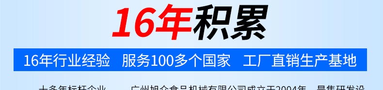 廣州旭眾食品機械有限公司是一家集科研開發(fā),生產(chǎn)設計,營銷服務為一體的現(xiàn)代化生產(chǎn)企業(yè)?,F(xiàn)代化生產(chǎn)車間,精湛制造技術,所產(chǎn)機械歷經(jīng)市場重重考驗,不斷贏得海內(nèi)外客戶的贊譽。