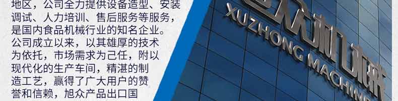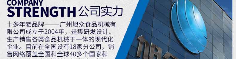 廣州旭眾食品機械有限公司是一家集科研開發(fā),生產(chǎn)設計,營銷服務為一體的現(xiàn)代化生產(chǎn)企業(yè)?,F(xiàn)代化生產(chǎn)車間,精湛制造技術,所產(chǎn)機械歷經(jīng)市場重重考驗,不斷贏得海內(nèi)外客戶的贊譽。