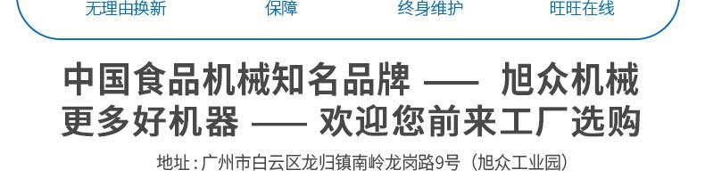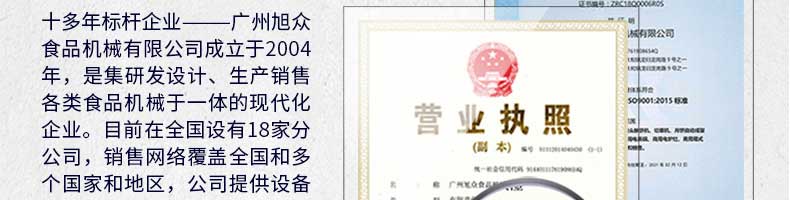 廣州旭眾食品機械有限公司是一家集科研開發(fā),生產設計,營銷服務為一體的現(xiàn)代化生產企業(yè)。現(xiàn)代化生產車間,精湛制造技術,所產機械歷經市場重重考驗,不斷贏得海內外客戶的贊譽。