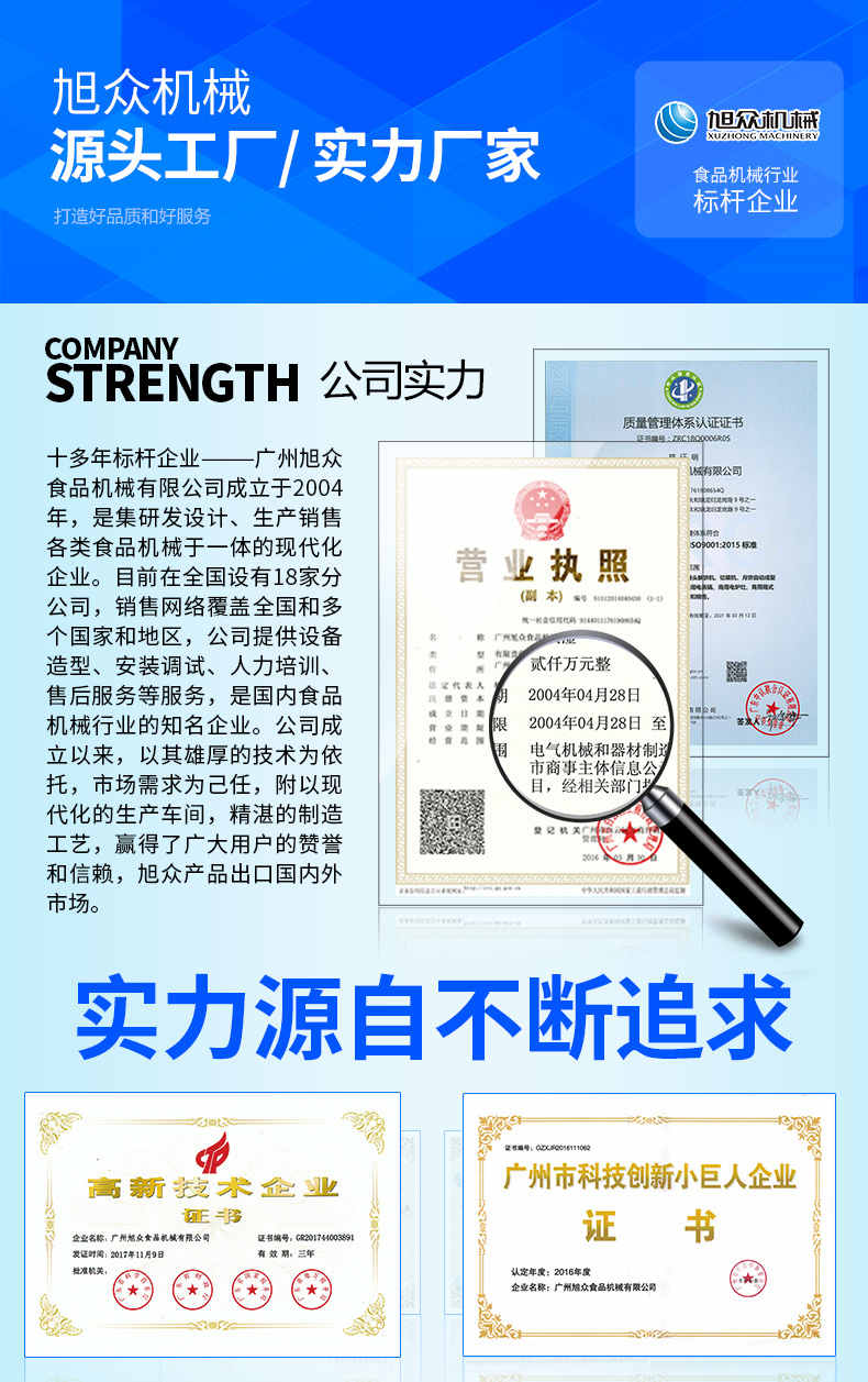 廣州旭眾食品機(jī)械有限公司是一家集科研開發(fā),生產(chǎn)設(shè)計(jì),營銷服務(wù)為一體的現(xiàn)代化生產(chǎn)企業(yè)。現(xiàn)代化生產(chǎn)車間,精湛制造技術(shù),所產(chǎn)機(jī)械歷經(jīng)市場重重考驗(yàn),不斷贏得海內(nèi)外客戶的贊譽(yù)。