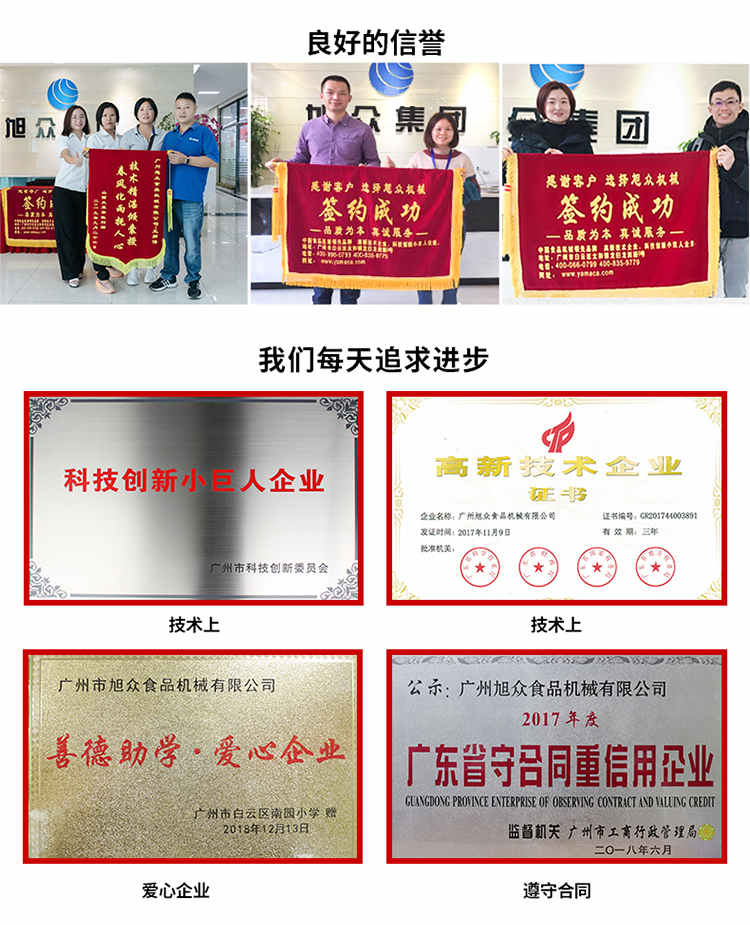 廣州旭眾食品機(jī)械有限公司是一家集科研開(kāi)發(fā),生產(chǎn)設(shè)計(jì),營(yíng)銷(xiāo)服務(wù)為一體的現(xiàn)代化生產(chǎn)企業(yè)?,F(xiàn)代化生產(chǎn)車(chē)間,精湛制造技術(shù),所產(chǎn)機(jī)械歷經(jīng)市場(chǎng)重重考驗(yàn),不斷贏得海內(nèi)外客戶的贊譽(yù)。