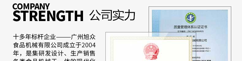 廣州旭眾食品機(jī)械有限公司是一家集科研開(kāi)發(fā),生產(chǎn)設(shè)計(jì),營(yíng)銷服務(wù)為一體的現(xiàn)代化生產(chǎn)企業(yè)。現(xiàn)代化生產(chǎn)車間,精湛制造技術(shù),所產(chǎn)機(jī)械歷經(jīng)市場(chǎng)重重考驗(yàn),不斷贏得海內(nèi)外客戶的贊譽(yù)。