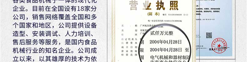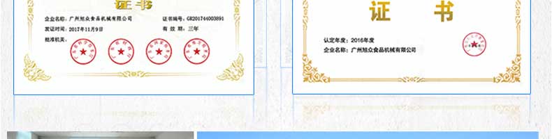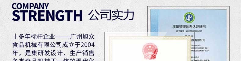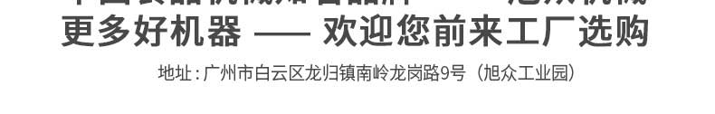 廣州旭眾食品機械有限公司是一家集科研開發(fā),生產設計,營銷服務為一體的現(xiàn)代化生產企業(yè)?,F(xiàn)代化生產車間,精湛制造技術,所產機械歷經(jīng)市場重重考驗,不斷贏得海內外客戶的贊譽。